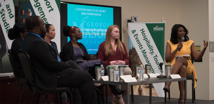 Dunn joined a panel of accomplished women who coached men in sports during the “Breaking Gender Roles: Women Coaching Men” Symposium on April 18. Hosted by Mason’s Division of Sport, Recreation and Tourism and the Center for Sport Management, the panel also included Victoria Sun, the director of basketball of operations for the George Washington University men’s basketball team; Natalie Randolph, the senior women’s administrator and Title IX coordinator for the D.C. Office of the State Superintendent of Education and the former head football coach at Coolidge High School; and Mason assistant track and field coach Sarana Hyatt.