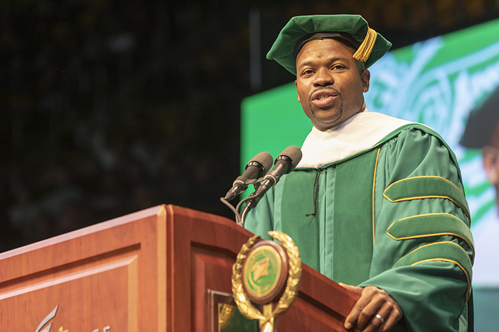 M. Brian Blake speaks at the afternoon ceremony for George Mason University's 2018 Winter Graduation. Photo by Lathan Goumas/Strategic Communications