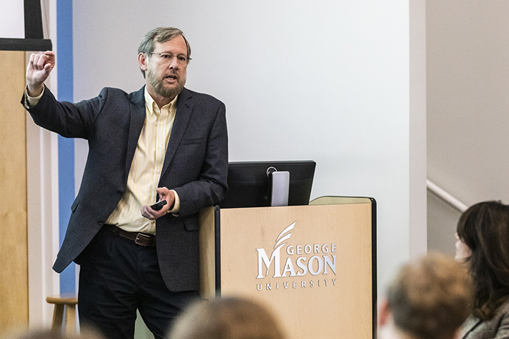 Dr. Karl Hausker, Senior Fellow in the Climate Program at the World Research Institute, discusses the clean energy transition during a lecture at George Mason University. Photo by Lathan Goumas/Strategic Communications