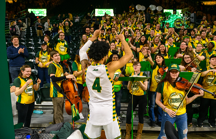 Livingston conducts the Green Machine pep band after his final game at EagleBank Arena, on March 5. Photo courtesy of Mason Athletics.