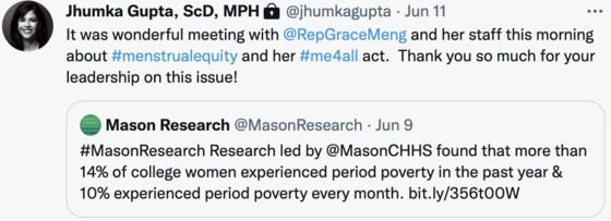After Gupta saw her research referenced on Rep. Meng’s social media, she reached out to Meng’s office to share additional resources. Rep. Meng’s office then proposed a meeting between Meng and Gupta. They met in June to talk about the results of her study and how Gupta could help inform Rep. Meng’s period poverty legislation in the future.