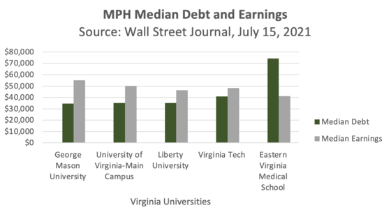 When compared against the other Master of Public Health programs in the state, Mason graduates had the lowest median debt at $34,709, the highest median income at $55,061, and also the best debt-to-income (0.63) ratio. Comparable numbers for Virginia Tech MPH graduates were $41,000, $48,265, and 0.85, and for University of Virginia MPH graduates, the numbers were $35,213, $50,231, and 0.7, respectively.