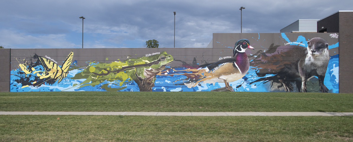 In the “Fauna of Belmont Bay,” the muralist and street artist from Budapest, Hungary, highlights four species that inhabit Belmont Bay: the yellow swallowtail butterfly (Papilio glaucus), the tree frog (Hyla cinerea), the wood duck (Aix sponsa), and the North American river otter (Lontra canadensis).