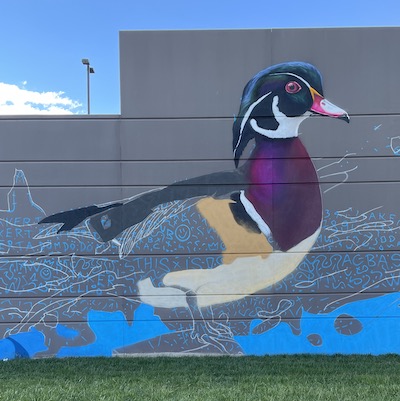 At a meet and greet in early October, TakerOne shared his techniques and artistic process with a group of community members. He found the species he highlighted on a Mason environmental science website that the Murals at Mason team had shared with him for inspiration. He experimented with alternate designs that included a fish and an osprey, but opted for the tree frog and wood duck to bring more color into the mural.