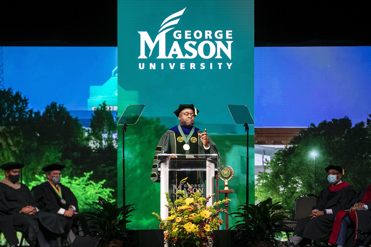 Mason alumna Charniele Herring, majority leader in the Virginia House of Delegates, served as host of ceremonies. Sen. Tim Kaine and Sen. Mark Warner, and many local and government officials and higher education leaders from throughout the Commonwealth of Virginia provided congratulatory greetings by video, including a message from Virginia Gov. Ralph Northam.
