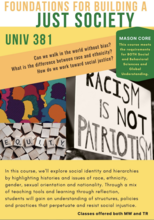 Students and faculty collaborated to create UNIV 381: Foundations for Building a Just Society, a three-credit class that fulfills two Mason Core requirements—global understanding and social/behavioral sciences—and is projected to evolve over time into a required course for all students.